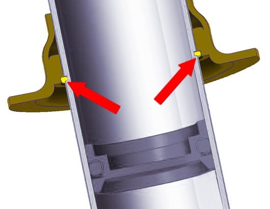 The spring seat collar needs to be located on the circlip correctly with the recess fitting securely on the circlip as indicated by the red arrows in the cross section diagram on the left. (The cross section of the circlip is indicated in yellow in this diagram).