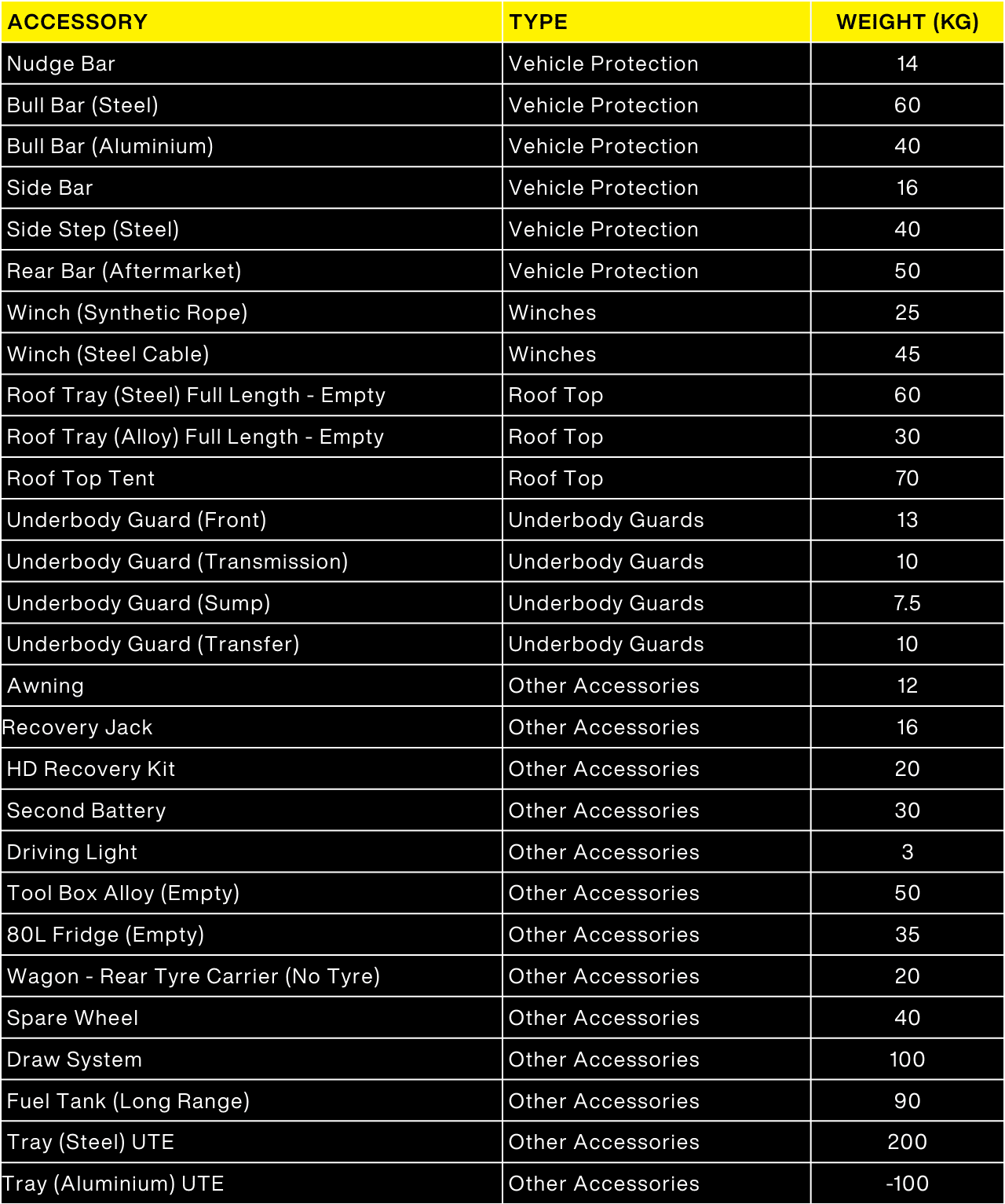 In the case of mining or tradesman vehicles a heavy duty set up is better suited for a constant load. If the factory tub has been replaced by a steel or alloy tray, take this weight factor into account when adding up the kilos in tool boxes, tools and equipment.