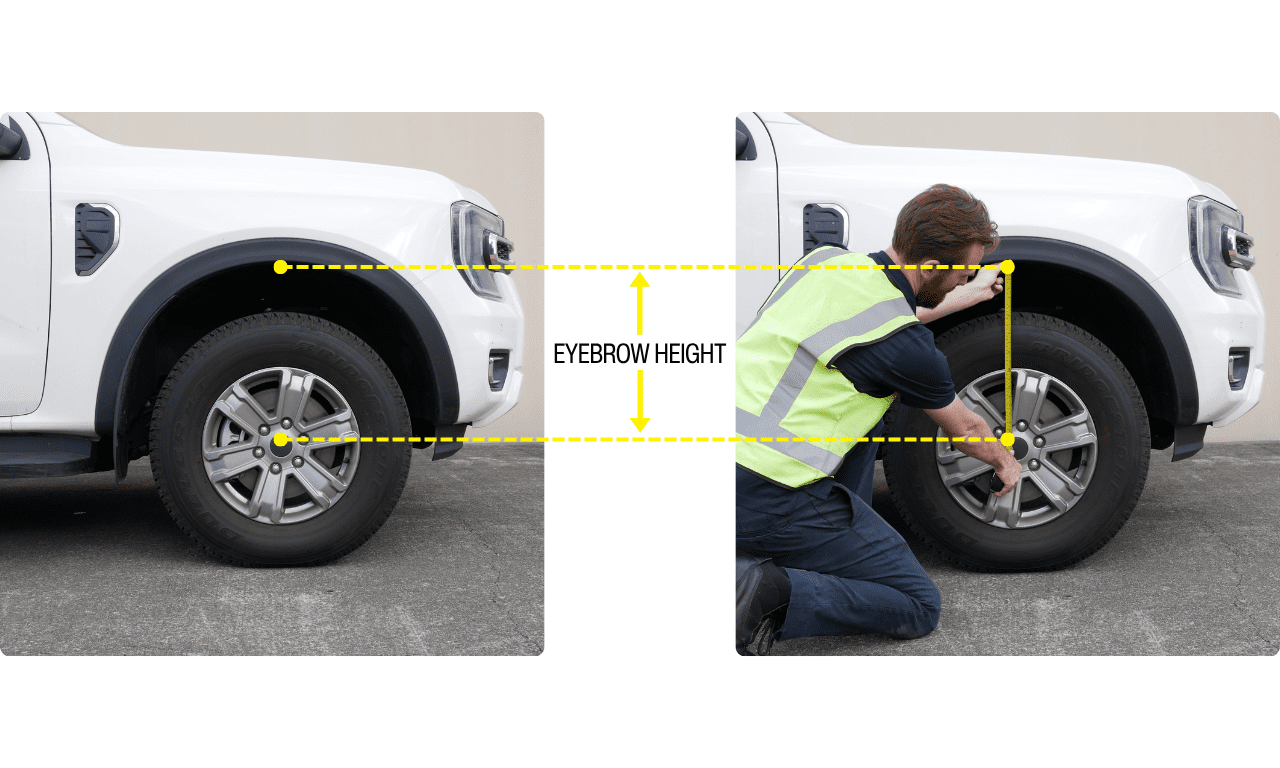 A: Ride height (also known as eyebrow height) is the height that your vehicle is sitting at. It is a very important parameter as it has a direct influence on a vehicle’s centre of mass (centre of gravity) and hence its stability and performance. This measurement is important because the law sates that you can not raise or lower your vehicle more than 50mm without an engineering certificate (for more information refer to VSB 14).