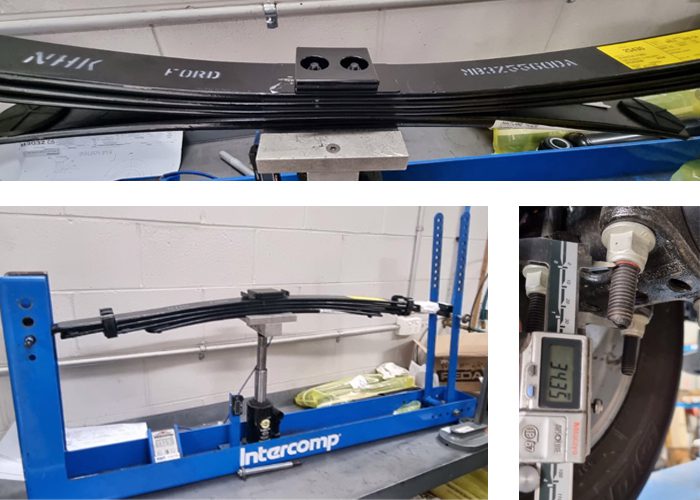 Above Top: Standard rear leaf spring with 2 centre pins. Above Left: Leaf spring on testing rig at RAW 4×4 facility. Above Right: Standard rear U-bolts being measured when mounted on the leaf.